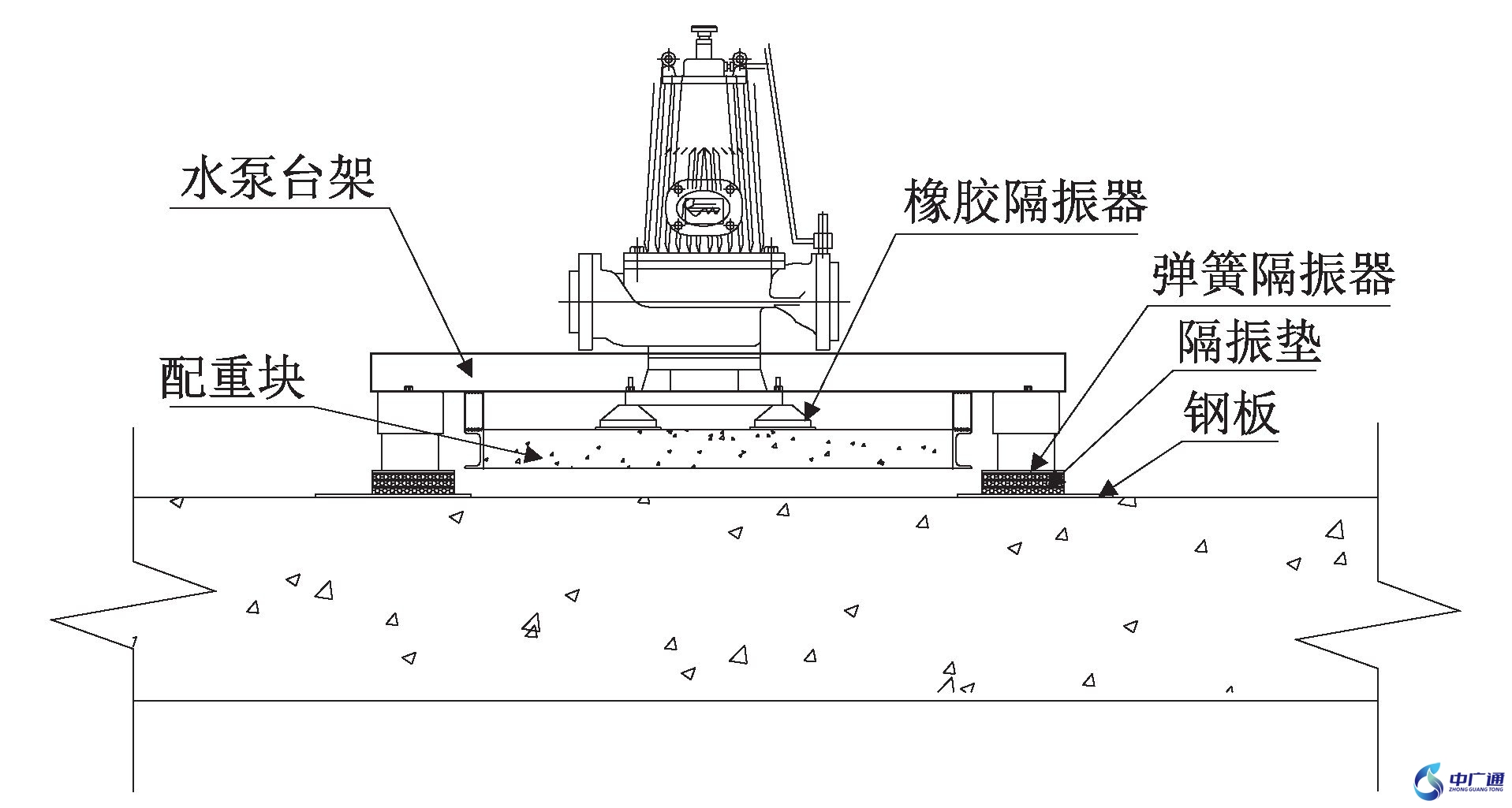 由于噪聲源的產(chǎn)生是振動(dòng)引起的,因此對(duì)噪聲的控制實(shí)際轉(zhuǎn)變?yōu)閷?duì)振動(dòng)的控制。振動(dòng)污染控制的3個(gè)途徑為:振源控制、傳遞過程中振動(dòng)控制、對(duì)防振對(duì)象進(jìn)行控制。常用的隔振設(shè)計(jì)方式為支承式、旁托式、內(nèi)嵌式。支承式是指隔振器設(shè)在被隔振設(shè)備基座或剛性臺(tái)座下。旁托式是指在臺(tái)座兩側(cè)設(shè)旁托支架,將隔振器安裝在旁托支架下部。內(nèi)嵌式是將隔振器嵌裝于鋼筋混凝土隔振臺(tái)座內(nèi)。