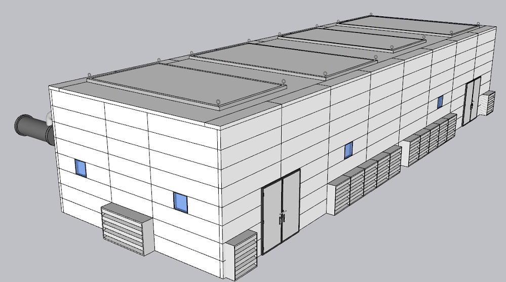 本次項(xiàng)目設(shè)備隔聲罩以鋼結(jié)構(gòu)為骨架,與基礎(chǔ)用螺栓連接;采用框架結(jié)構(gòu),保證結(jié)構(gòu)強(qiáng)度;采用吸隔聲模塊作為壁面主材。隔聲罩總體長(zhǎng)約為20m,寬約為6.7m,高度約為4m??諌簷C(jī)上方以每個(gè)空壓機(jī)的尺寸,每邊空開500mm左右做成一個(gè)整體的頂蓋,每個(gè)頂蓋做4個(gè)吊點(diǎn),方便設(shè)備整體吊裝檢修。隔聲罩內(nèi)部留有800mm~1000mm的檢修通道,同時(shí)在隔聲罩上開設(shè)觀察窗和照明系統(tǒng),可供人員日常巡查檢修。